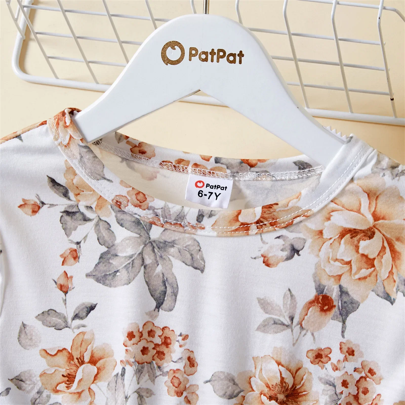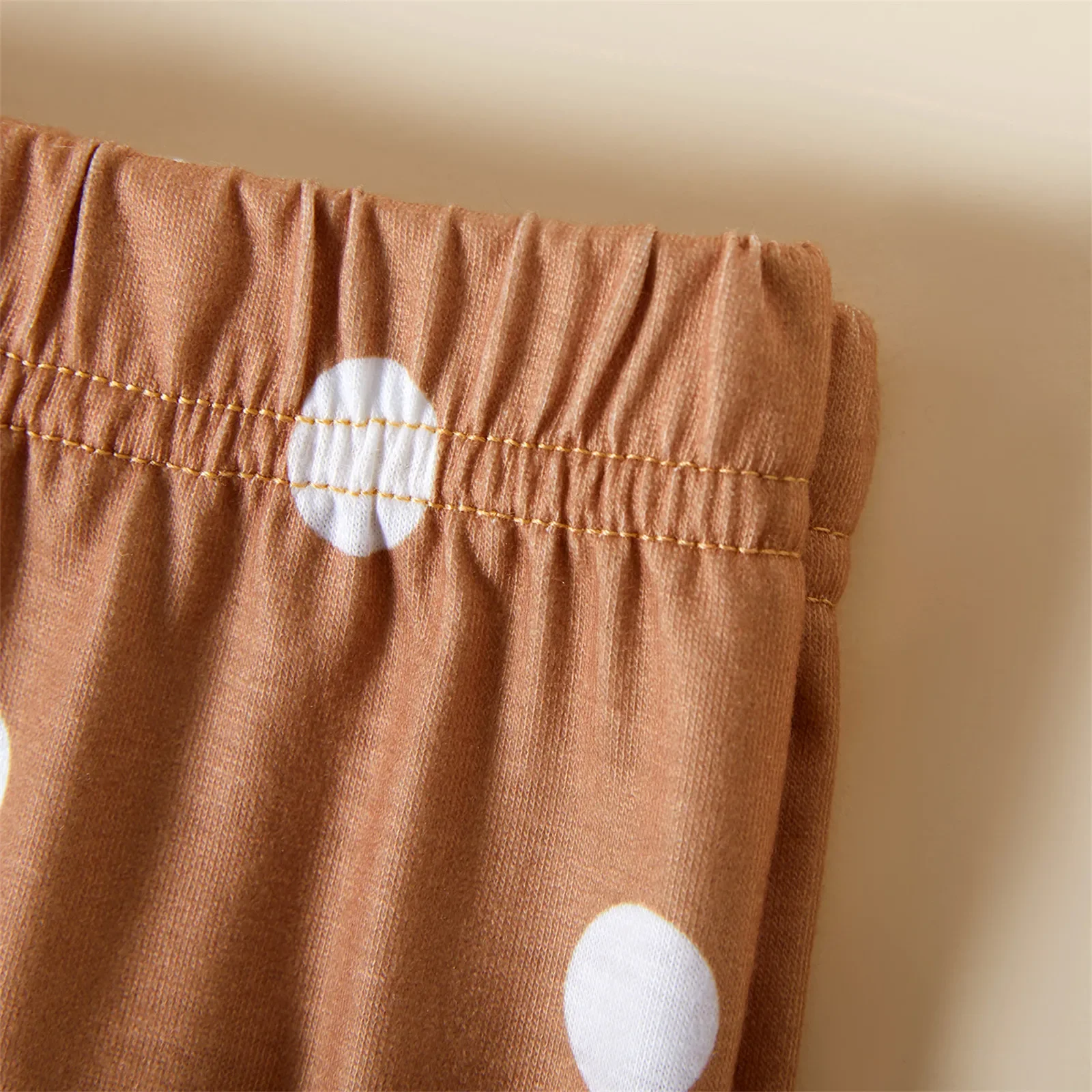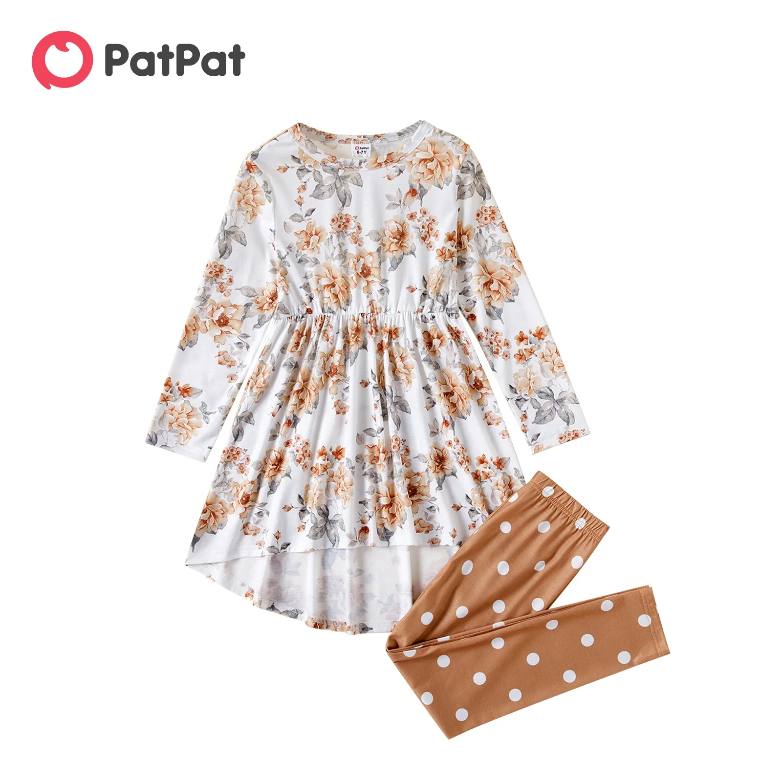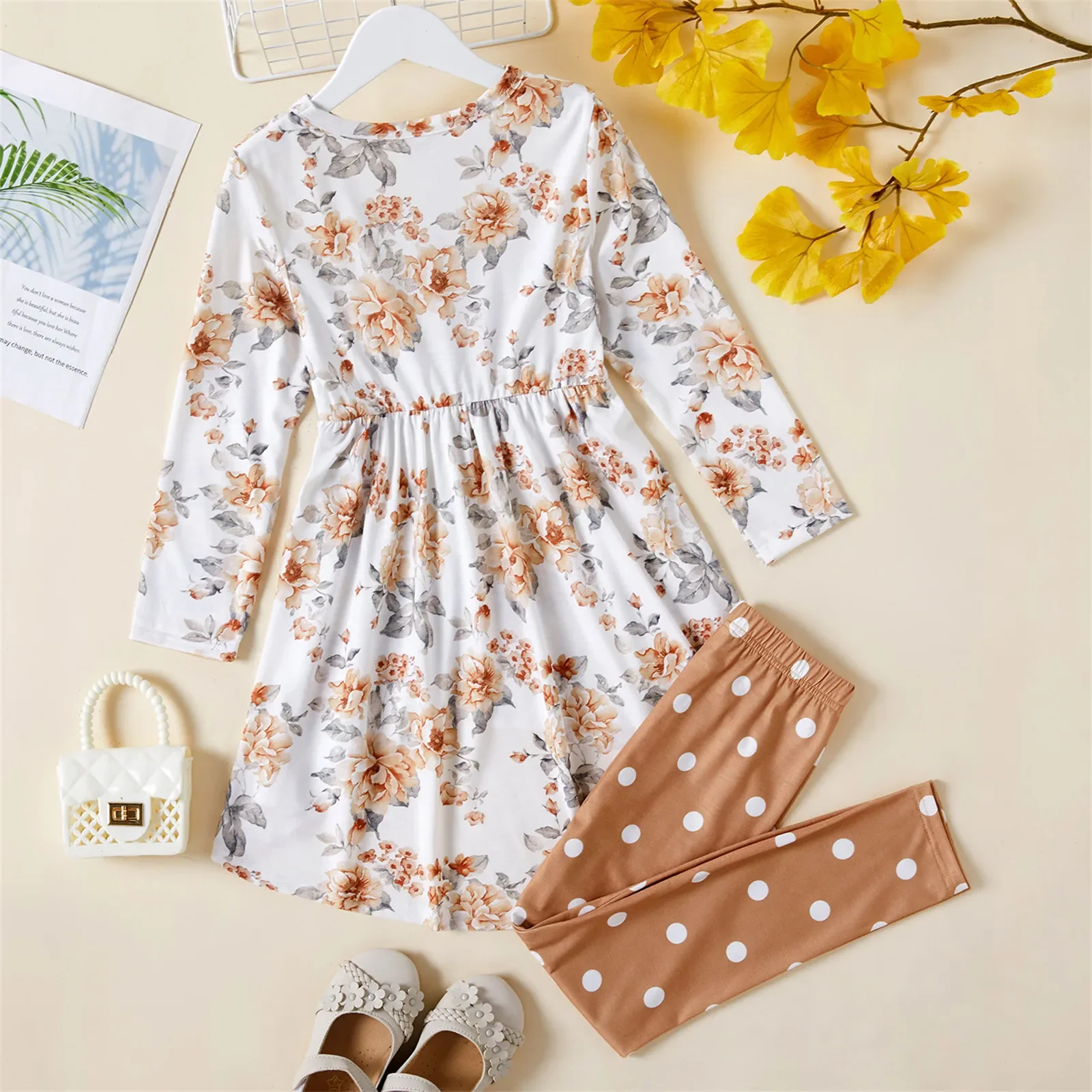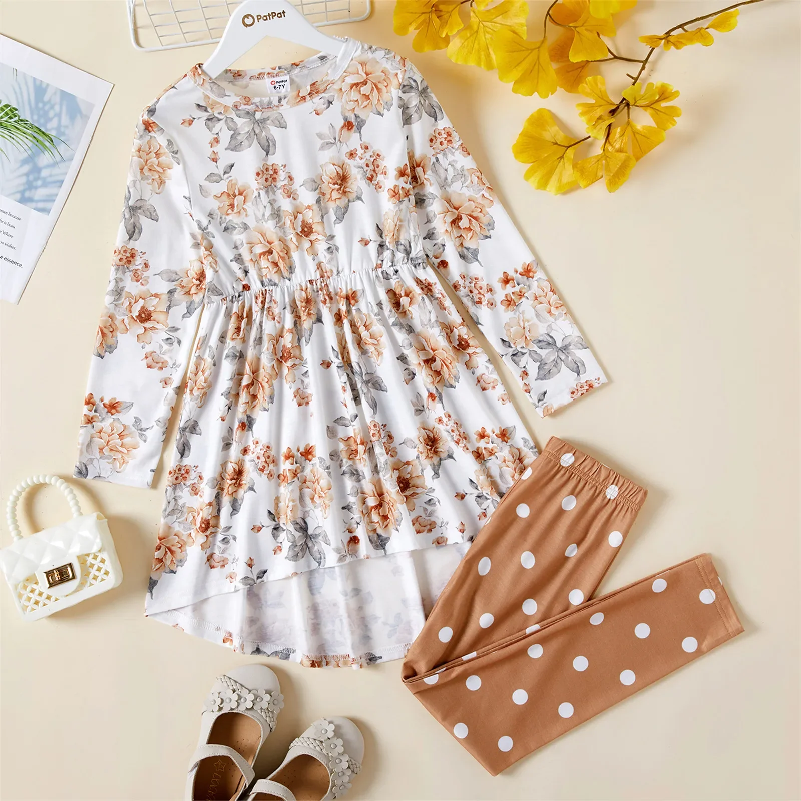 2pcs Kid Girl Floral Print High Low Long-sleeve Tee and Polka Dots Leggings Sets Soft and Comfortable Basic Style