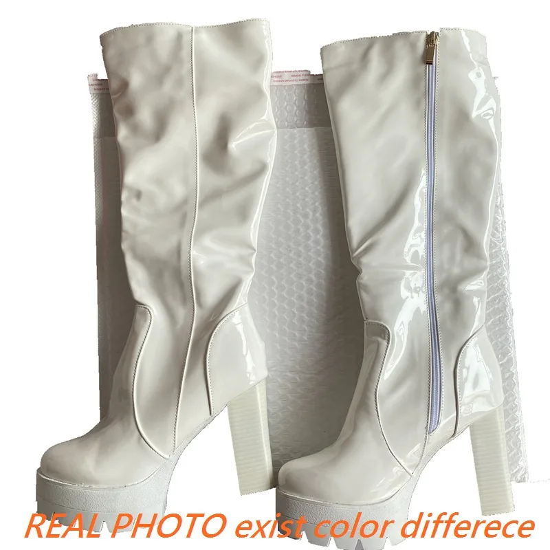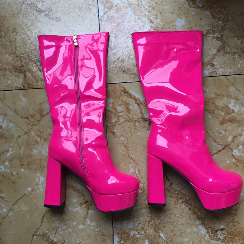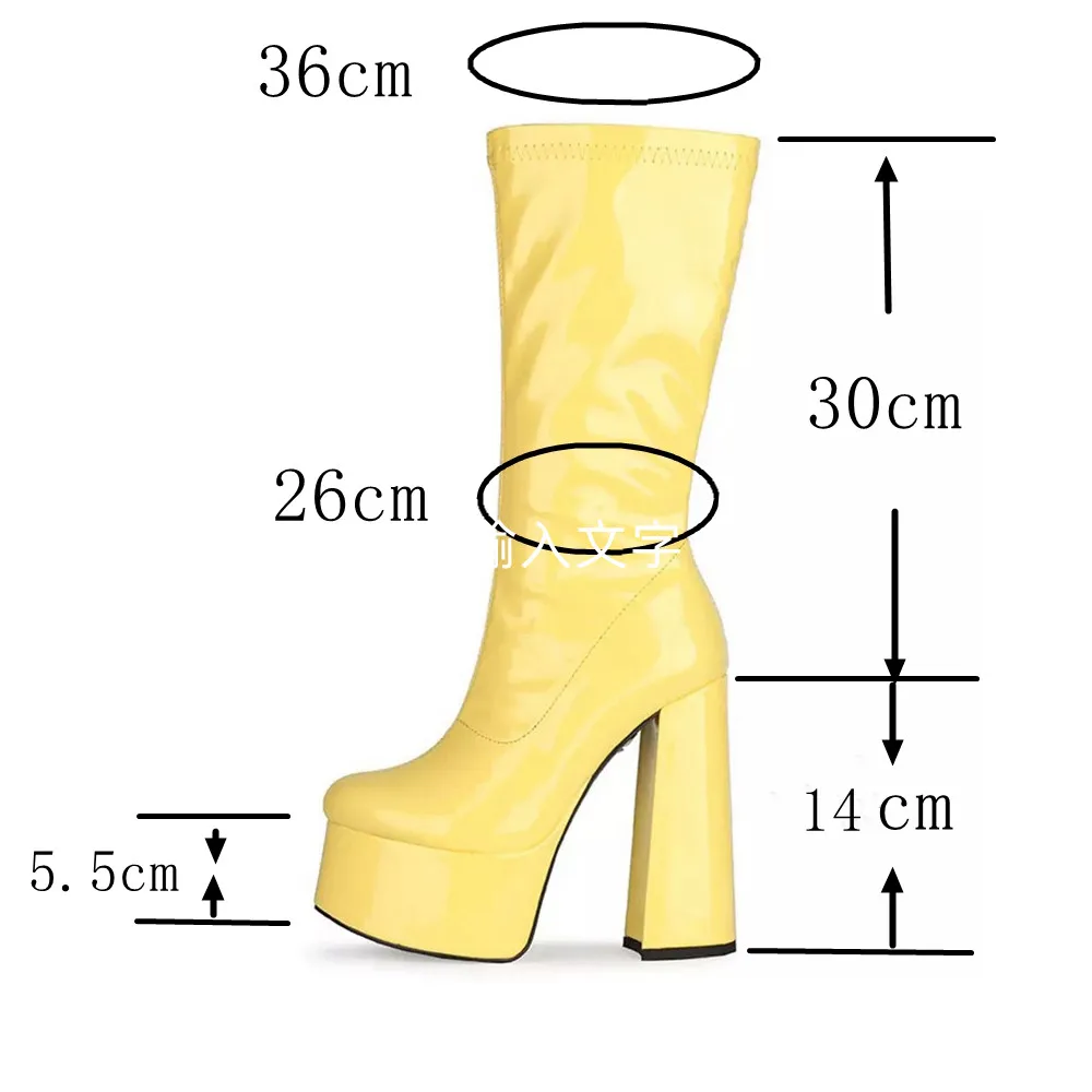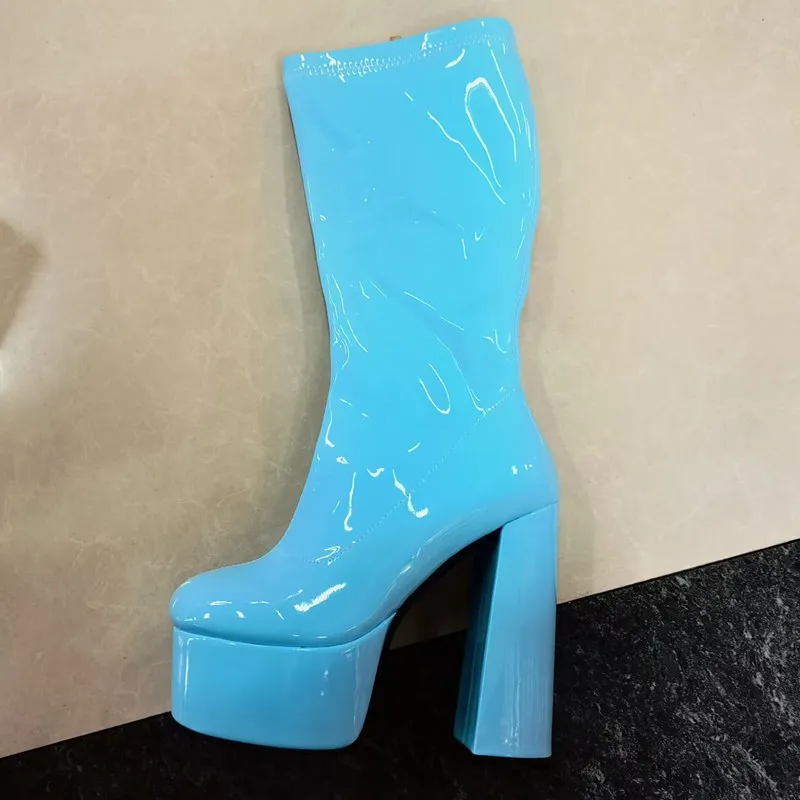Luxury Designer Platform Block High Heels Patent Leather Mid Calf Boots Candy Color Zipper Goth Big