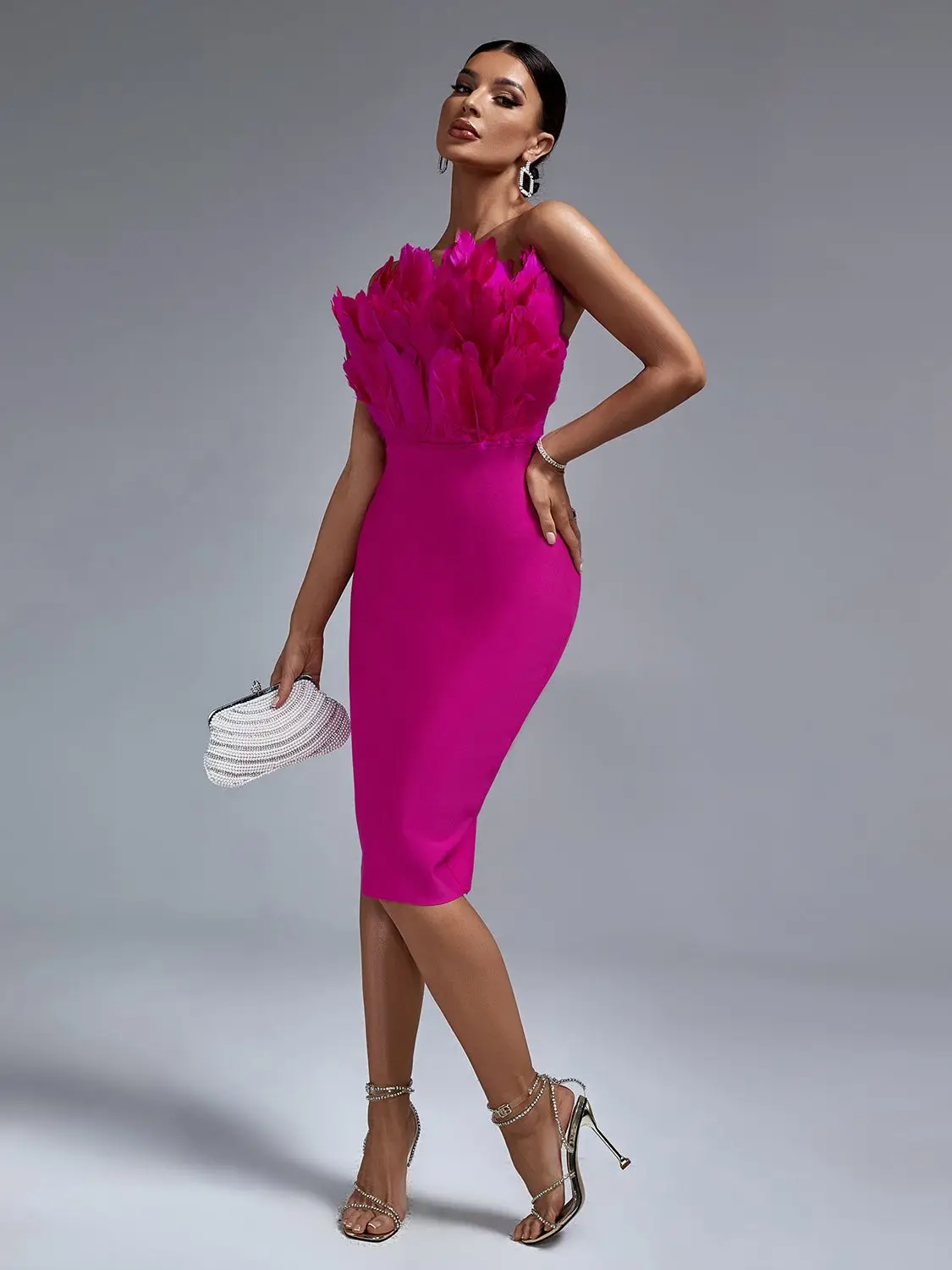 Pink Bandage Dress Women Feather Party Dress Bodycon Elegant Midi Sexy Strapless Evening Outfits