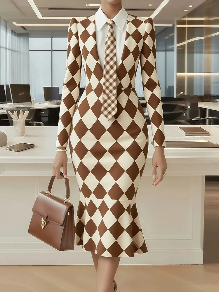 Turn-Down Collar Simple Mermaid Dress, Women Spring Autumn Long Sleeve Print Trumpet Dress